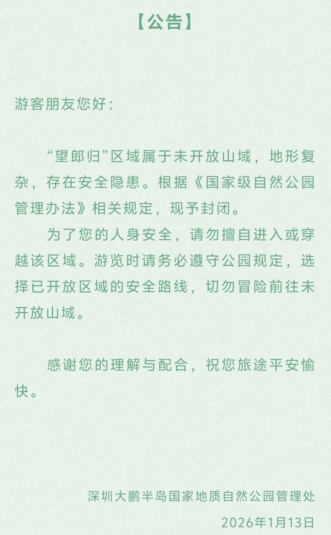1月13日,深圳大鹏半岛国家地质自然公园管理处发布公告,对“望郎归”区域进行封闭管理。事实上,自2023年以来,公园管理处已参与救援行动两百多起,设置大量警示牌并开展常态化巡查劝阻,却仍挡不住游客的冒险脚步,甚至有驴友对封闭表示“遗憾”,质疑管理“一刀切”。望郎归景色虽美,也绝不能用一次冒险的行程,去赌一个不确定的归期。